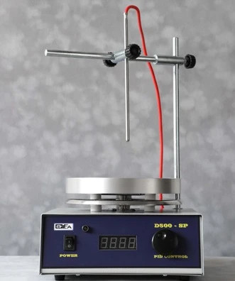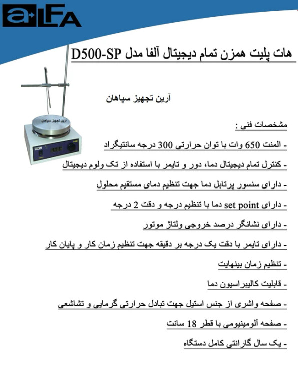 هات پلیت مگنت دیجیتال مدل D500-SP برند آلفا تک می باشد. رنج تنظیم دما از ۵۰ تا۳۷۰ درجه در مرکز المنت می باشد. مجهز به سنسور حرارتی pt۱۰۰ می باشد.میزان چرخش دور مگنت از ۱۰۰ تا۱۸۰۰ می باشد.المنت ۶۵۰ وات کانتال سوید است. قطر صفحه ۱۸ سانت است. قابلیت چرخش مگنت ۲ تا ۸ سانت و تایمر دیجیتال دارد. نحوه عملکرد این نوع از هات پلیت مغناطیسی به این صورت است که این دستگاه از یک همزن مغناطیسی استفاده می کند که این همزن به شکل کپسول آهنربایی پوشش دار درون محلول قرار میگیرد و با شروع چرخش صفحه همزن در جهت حرکت صفحه شروع به گردش می کند و مایع درون ظرف را به صورت گردابی به حرکت در می آورد. صفحه هات پلیت مگنت دیجیتال مدل D500-SP که محل قرار گرفتن ظروف است توسط آهنرباهایی که در یک سیستم الکترو مغناطیسی قرار گرفته اند حرکت می کند و دارای قطب های مثبت و منفی است که حول یک محور دایره ای گردش می کنند، بنا بر این وقتی مگنت آهنربایی بر روی این سطح قرار می گیرد، به دلیل وجود نیروی جاذبه بین دو قطب نا هم نام در دو آهنربا ،در جهت حرکت صفحه هات پلیت شروع به حرکت می کند.