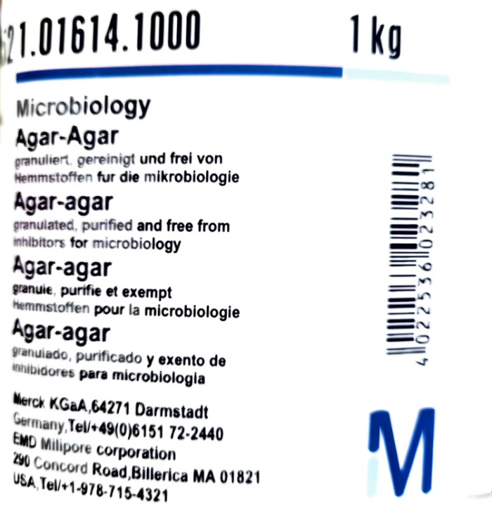 پودر آگار آگار یک ژلاتین گیاهی سفید و نیمه شفاف است که از جلبک دریایی گرفته می شود. پودر آگار آگار در واقع همان آگار است که به عنوان یک ماده تثبیت کننده و ضخیم کننده استفاده می شود. آگار مخلوطی از دو جز است: آگارز پلی ساکارید خطی و مخلوط ناهمگنی از مولکول های کوچکتر به نام آگاروپکتین. این ترکیبات ساختار حمایت کننده ای را در دیواره سلولی گونه های خاصی از جلبک ها تشکیل می دهد و با جوشاندن آزاد می شود. این جلبک ها به نام آگاروفیت شناخته می شوند و متعلق به جلبک قرمز هستند. از نظر شیمیایی ، آگار پلیمری است که از زیر واحد های قند گالاکتوز تشکیل شده است. با توجه به این نکته که محیط کشت آگار آگار یک محیط کشت میکروبیولوژی می باشد باید بیان کرد که محیط کشت میکروبیولوژی (microbiological culture) که به ویژه به منظور رشد دادن میکروبها (شامل باکتری ها، قارچ ها و …) استفاده میگردد، و به علت دارا بودن آگار در ترکیب خود به صورت جامد بوده و متناسب با میکروارگانیسم ها و آزمایش های مورد نظر میتوان آنها را در لوله ظروف پتری و یا ظروف دیگر مورد استفاده قرار داد. با در نظر گرفتن این نکته که ترکیبات محیط های کشت می بایت بسیار دقیق و حساس باشد شرکت merck آلمان از تمامی تکنولوژی های روز دنیا بهره گرفته و محیط های کشت را با دقت و حساسیت هرچه تمام تر تولید می کند.