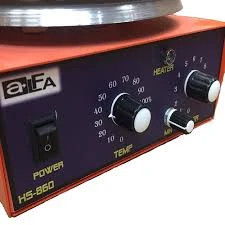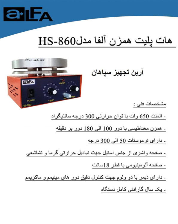 مشخصه مقدار مدل HS860 نوع کنترل آنالوگ جنس صفحه آلومینیومی قطر صفحه گرمایش 18 cm توان المنت گرمایش 650 W حداکثر دمای سطح 300 °C محدوده تنظیم دما 50–300 °C حداکثر حجم همزن مغناطیسی 5 L (برای آب) سرعت همزن 100–1800 RPM ابعاد دستگاه 25 × 23 × 15 cm ولتاژ کاری 220 V